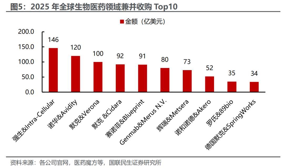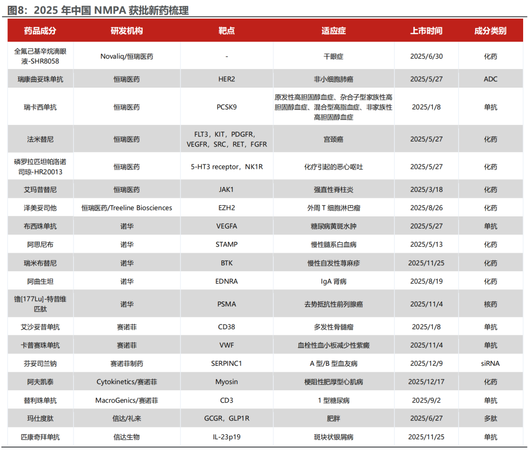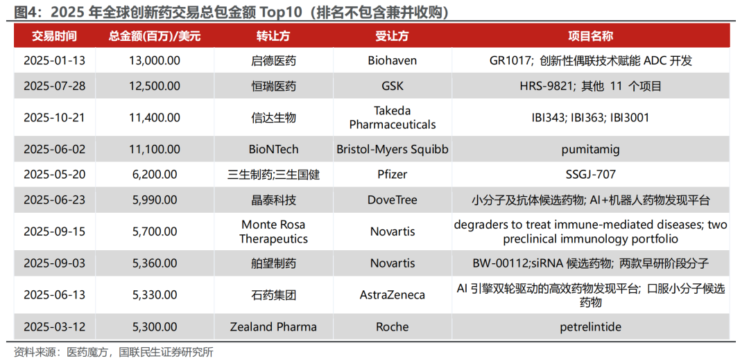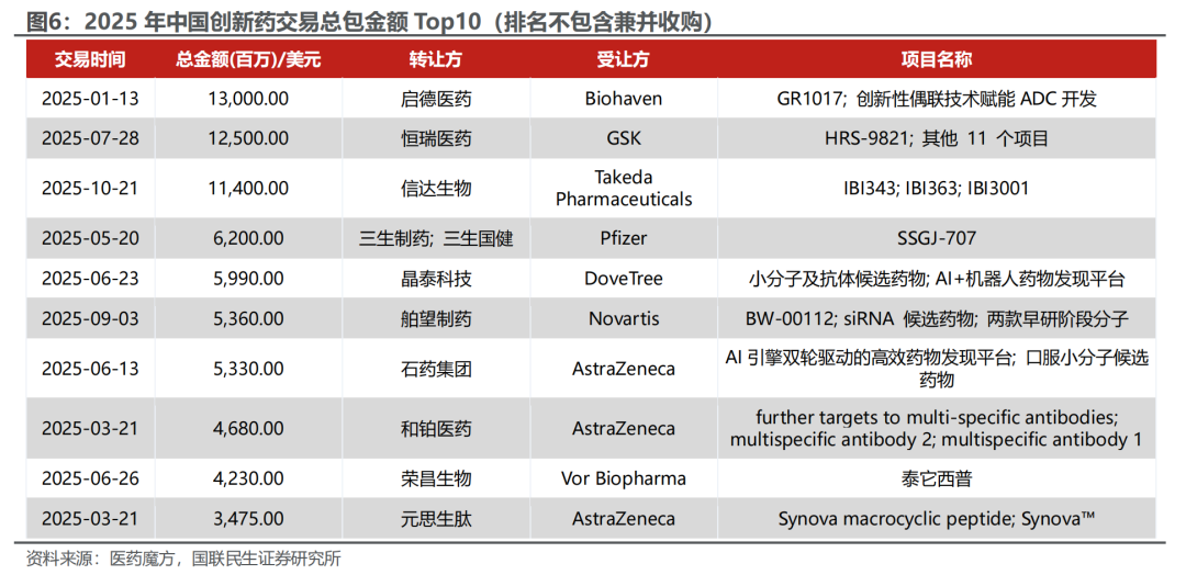 2025年中国创新药平台/在研管线于全球市场大放异彩,多国内原研药企上榜全球新药BD交易总金额Top10(不包含兼并收购)。启德、恒瑞、信达三家包揽前三,ADC与多抗组合成为跨国药企差异化竞争的“补管线”首选,技术平台溢价显著;石药、舶望、晶泰则分别以口服小分子、siRNA及AI药物发现平台切入,显示国内创新形态由单分子向“技术栈”升级。整体而言,随着更多原创靶点进入临床验证、国内CXO与供应链持续降本增效,我们认为中国创新药有望在全球BD舞台长期占据头排,推动产业链估值再上新台阶。