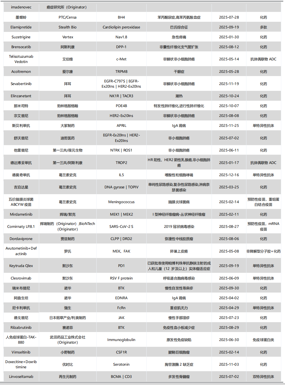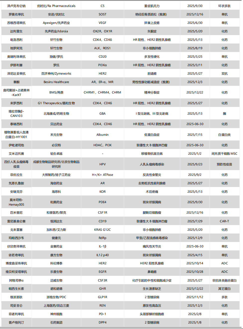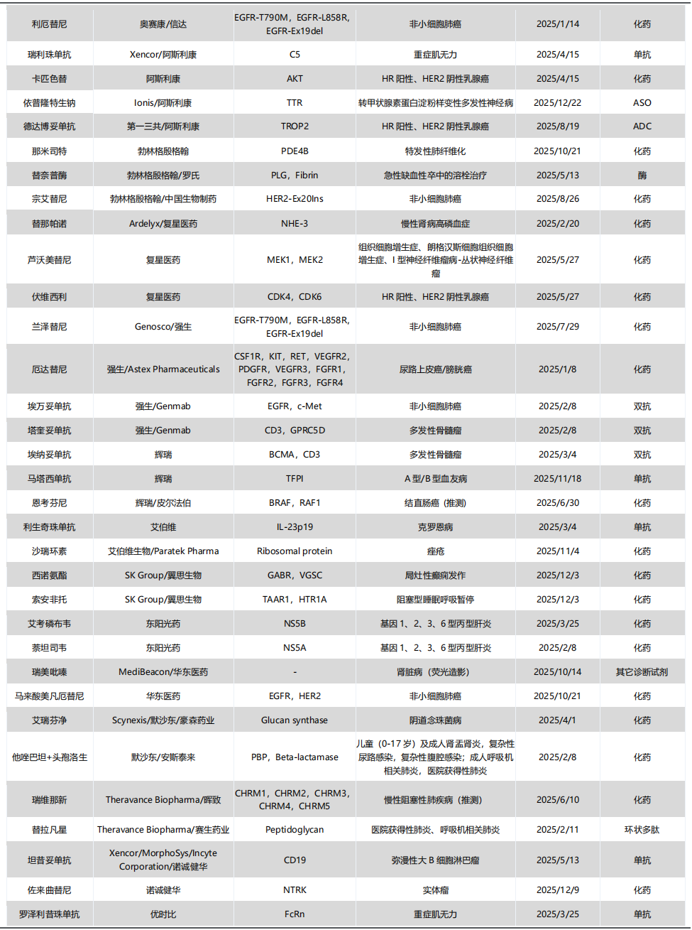 2)从数量上看:与近年相比,今年CDER批准的新药数量略有下降,但First-In-Class产品占比超过半数,药物类型涉及siRNA、ASO、ADC、双抗、多肽、非降解型分子胶、非抗体类融合蛋白等;