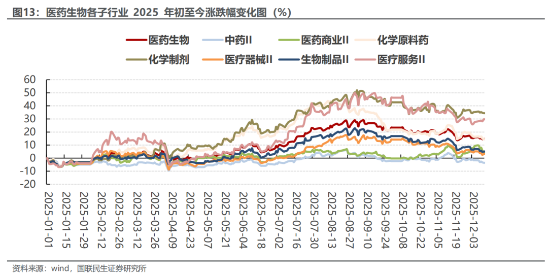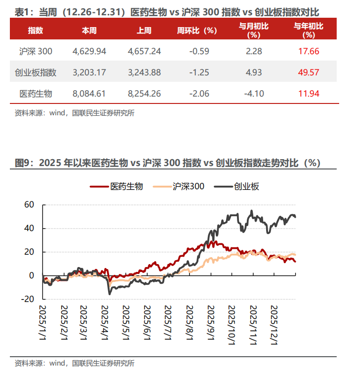 当周(12.26-12.31)医药生物指数环比-2.06%,跑输创业板指数和沪深300指数。当周医药生物指数周环比-2.06%,沪深300指数周环比-0.59%,创业板指数周环比-1.25%,医药跑输沪深300指数1.47个百分点,跑输创业板指数0.80个百分点。2025年初至今医药生物上涨11.94%,沪深300上涨17.66%,创业板指数上涨49.57%,医药跑输沪深300指数,跑输创业板指数。