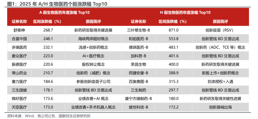 2025年医药板块A/H股价总体大幅回暖,涨幅靠前标的以创新管线数据读出/BD交易落地、AI /流感主题挂钩为主要催化。从创新管线数据/BD催化的典型代表看,2025年6月,三生制药公布其与辉瑞关于SSGJ-707达成总金额超60亿美元的BD交易,刷新中国创新药单笔授权交易记录,驱动三生制药及三生国健股价初步兑现。在辉瑞紧密相接的海外临床开启,进一步验证管线创新属性的背景下,三生制药已经进入BD交易的递进式催化。该类叙事为2025年医药生物行业向上复苏的主要范式,同时市场交易预期也在龙头领跑的浪潮下进行外延映射,带动拥有早期临床数据支持的优质项目在股价上进行预期叠加。