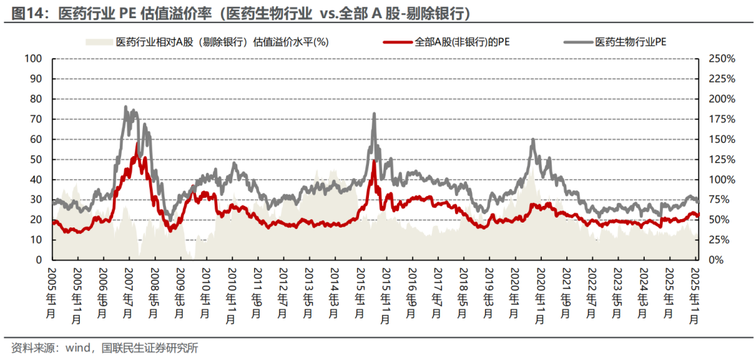 估值水平上升,处于平均线下。当周,医药行业估值PE(TTM,剔除负值)为28.62,较上一周下降0.58个单位,比2005年以来均值(35.89)低7.27个单位,当周医药行业整体估值下调。行业估值溢价率处于平均线下。当周医药行业PE估值溢价率(相较A股剔除银行)为24.00%,较上一周下降2.37个百分点。溢价率较2005年以来均值(55.05%)低31.04个百分点,处于相对低位。