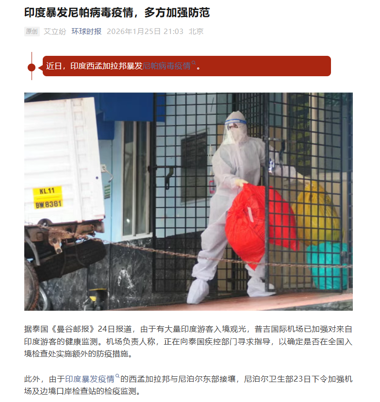 近日,印度西孟加拉邦暴发尼帕病毒疫情,印度当局正采取措施应对西孟加拉邦暴发的尼帕病毒疫情,泰国、尼泊尔等地已经下令加强机场及边境口岸检查站的检疫监测。
