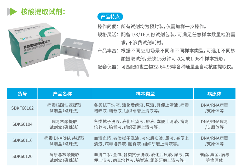 硕世生物核酸提取试剂采用预封装形式,仅需一步手动操作。不同的提取试剂盒可以满足不同样本类型和病原体需求。同时可匹配硕世生物32、64、96等各种通量全自动核酸提取仪。