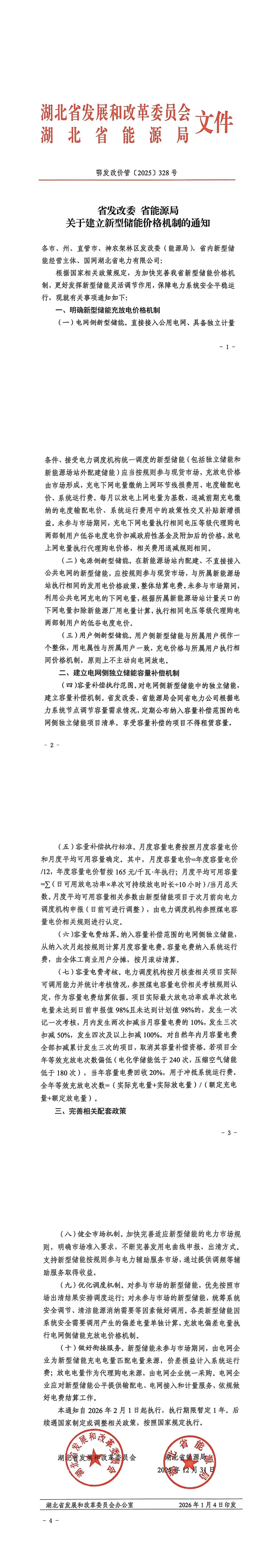 2026年1月4日,湖北省发展改革委、湖北省能源局发布《关于建立新型储能价格机制的通知》,政策自2026年2月1日起执行,执行期限暂定1年。