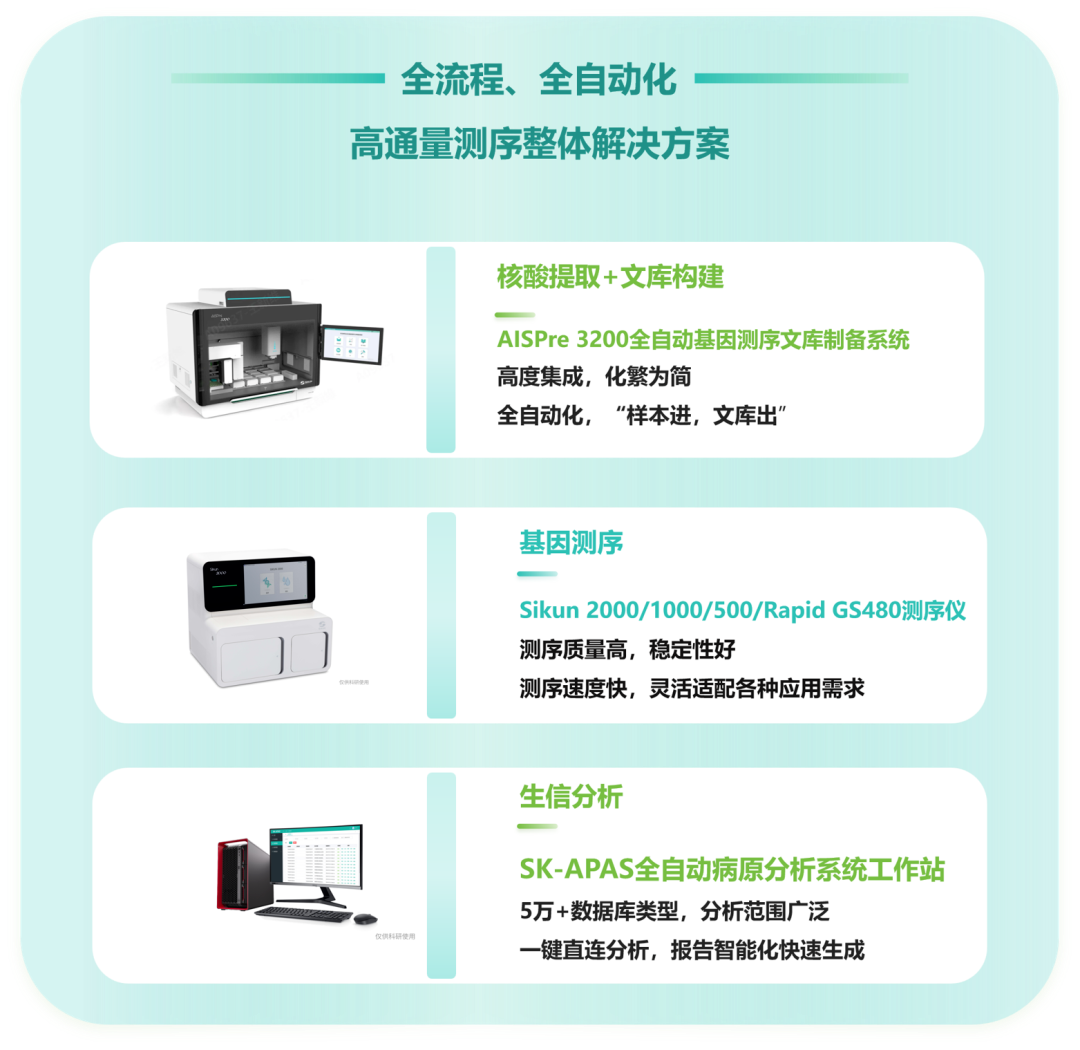 为满足疫情防控“精准溯源”的核心需求,安图生物子公司思昆生物推出的高通量测序平台,拥有AISPre 3200全自动基因测序文库制备系统、Sikun系列基因测序仪和全自动病原分析系统,可打造“核酸提取-文库构建-上机测序-数据分析”的一站式测序流程,为快速精准识别尼帕病毒及病毒溯源提供高效解决方案。