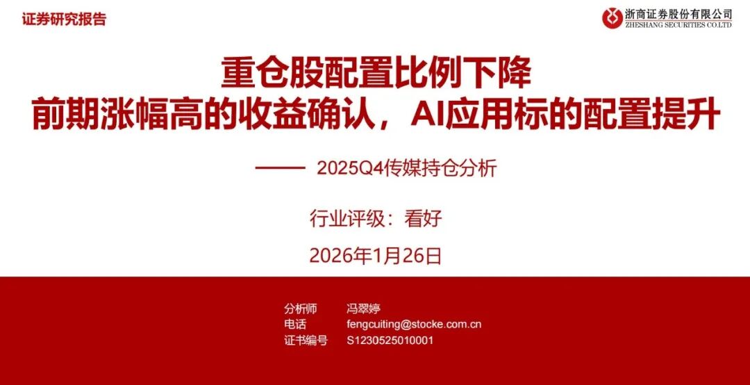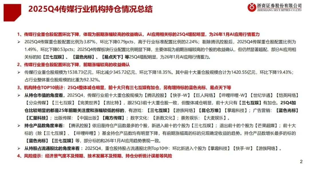 1、传媒行业重仓股配置环比下降,体现为前期涨幅较高的收益确认,AI应用相关标的25Q4增配明显,为26年1月AI应用行情蓄力