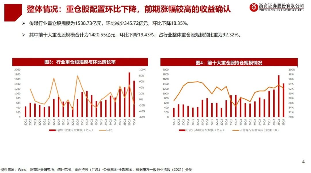 2、传媒行业重仓股配置环比下降,前期涨幅较高的收益确认