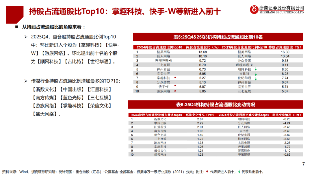 从持股占流通股比的角度来看 :2025Q4,重仓股持股占流通股比例Top10中:环比新进入个股为【掌趣科技】【快手-W】【游族网络】。