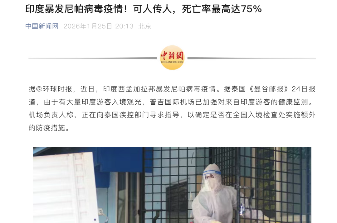 中国新闻网发布,据@环球时报,近日,印度西孟加拉邦暴发尼帕病毒疫情。据泰国《曼谷邮报》24日报道,由于有大量印度游客入境观光,普吉国际机场已加强对来自印度游客的健康监测。