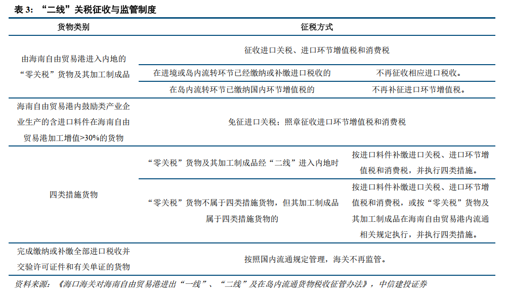 根据海南自贸港有关政策规定,在“二线”将主要实施口岸海关监管与申报制度、出岛货物运输物流信息管理制度、关税征收与监管制度以及加工增值免关税等制度措施。封关后货物由海南自由贸易港进入内地的,应经由“二线口岸”通行并接受相应管理,采取双轨制管理模式:一种针对“零关税”货物及其加工制成品、享受加工增值免关税政策的保税货物、自境外进入海南自由贸易港时放宽贸易管理措施的货物及其加工制成品,除特殊情形外,应从海关监管通道通行,并接受海关监管,在岛内环节已经验核的,不再重复验核。另一种则针对其他国内流通货物,经非海关监管通道通行,由海南省按现行国内流通规定管理。