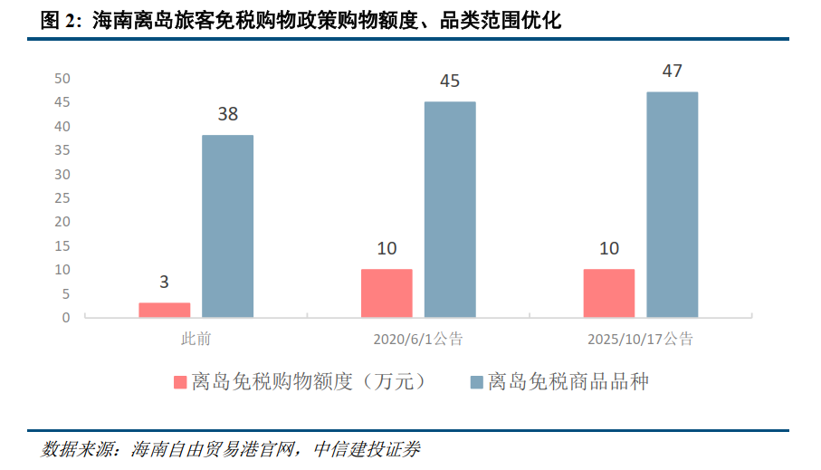 为了支持海南自由贸易港建设,财政部、海关总署、税务总局联合印发公告,从2025年11月1日起,调整升级海南离岛旅客免税购物政策。一是扩大离岛免税商品范围,增加宠物用品、可随身携带的乐器、微型无人机、小家电等商品。优化后的离岛免税商品由45大类提高至47大类。二是允许服装服饰、鞋帽、陶瓷制品、丝巾、咖啡、茶等国内商品,进入离岛免税店销售,退(免)增值税、消费税。三是将离岛旅客免税购物年龄由年满16周岁调整为年满18周岁。四是允许离境旅客享受离岛免税政策,离岛且离境旅客购买离岛免税商品金额计入其每年10万元人民币免税购物额度,不限次数。离岛且离境旅客在规定的额度和数量范围内,在离岛免税店内或经批准的网上销售窗口购买免税品,免税店根据旅客离岛时间运送货物,旅客凭购物凭证仅能在机场、港口码头指定区域提货,并一次性随身携带离岛。五是对一个自然年度内有离岛记录的岛内居民,在本自然年度内可按“即购即提”提货方式有关要求,不限次数购买离岛免税商品。