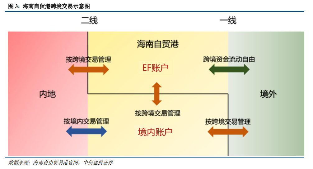 2023年8月,中国人民银行海南省分行公布了《海南自由贸易港多功能自由贸易(电子围网)账户业务管理办法(征求意见稿)》,并使用全新术语“EF账户”,EF即电子围网Electronic Fence。同日,人行广东省分行也公布了适用于横琴粤澳深度合作区的EF账户管理办法。2024年4月,《海南自由贸易港多功能自由贸易账户业务管理办法》发布,海南自由贸易港多功能自由贸易账户自2024年5月6日正式上线。在封关运作的背景下,EF账户体系的建立是金融开放的基础设施升级,也是实现“一线放开、二线管住”制度设计的核心支撑。