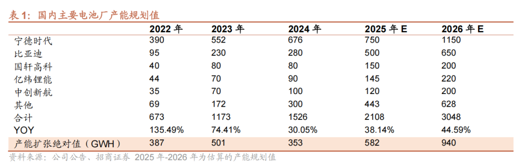 锂电池产业扩产进入加速阶段。过去几年,全球锂电池需求持续超预期,2025年由于头部企业产能不足,开始出现订单外溢,25年下半年二三线厂商也连续开始供不应求。从25年开始,主要锂电池企业均开始了新一轮大规模的产能扩张,据不完全统计,2026年锂电预计新增扩产接近1TWH,创历史新高。近期头部锂电厂商陆续开启设备招标,目前已能看到数百GWh的头部厂商订单,后续预计还有百GWh规模的订单。