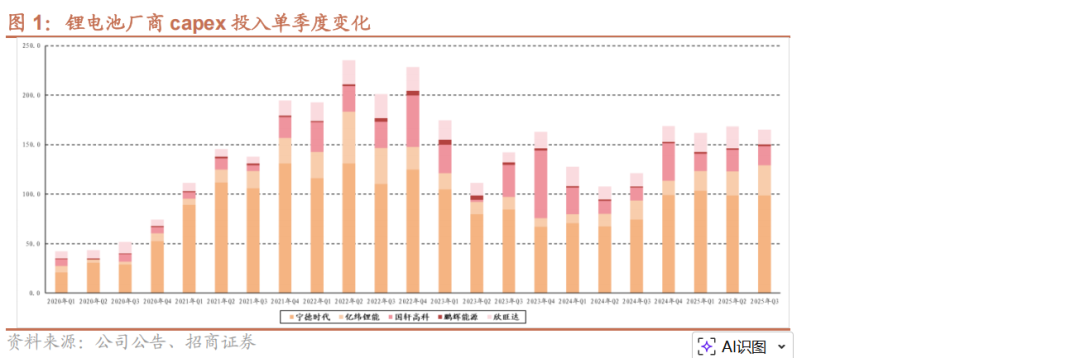 据不完全统计,2026年锂电预计新增扩产接近1TWH。24年底头部企业率先启动本轮扩产,25年Q2左右,二线陆续开始加码扩产。我们看到国内头部锂电厂商2025年前三季度累计CAPEX同比均恢复增长,宁德、亿纬等头部厂商同比增速显著突出,宁德超40%、亿纬超80%,从25年的capex投入增长趋势看26-27年整个行业的投资强度有望超过上一轮周期。