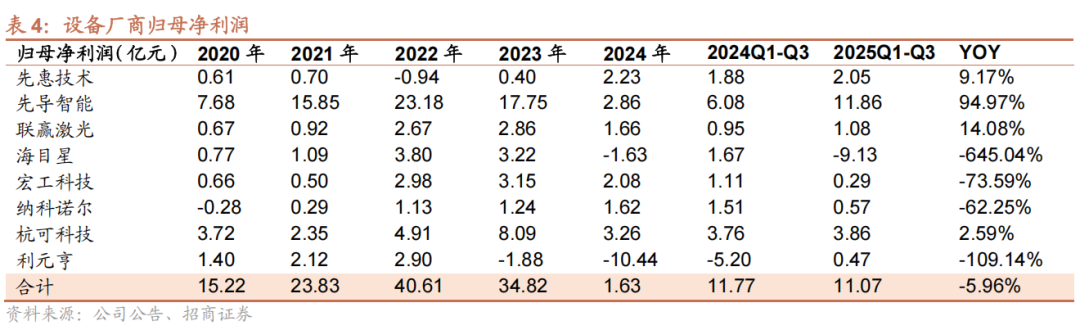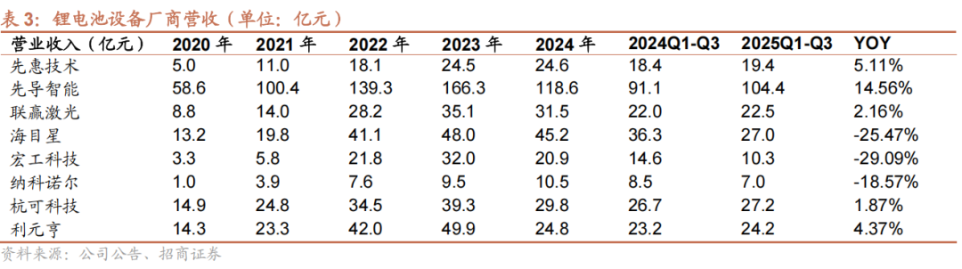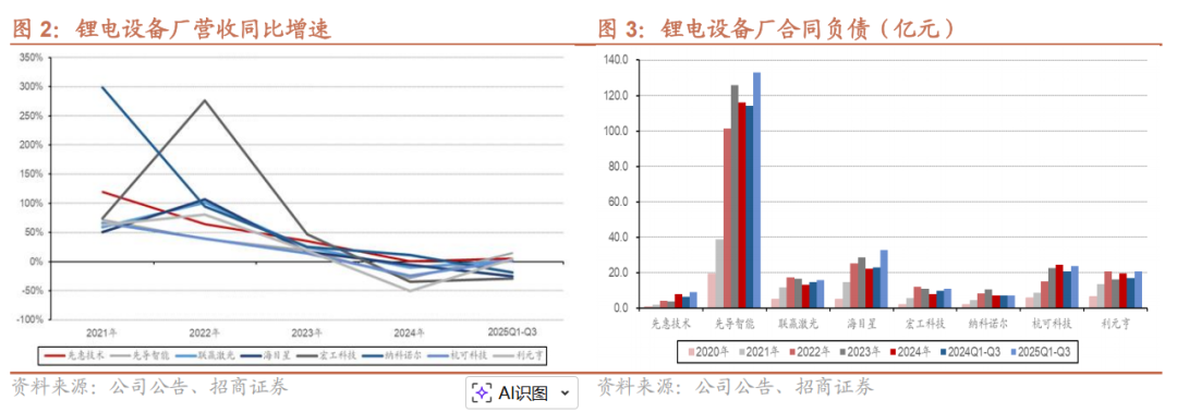 锂电设备厂合同负债创新高,业绩有望恢复高增长。锂电设备多为大型非标定制化产品,从设计、生产、安装调试到最终验收,订单完成需要较长时间。合同负债可以作为公司未来业绩增速的前瞻指标,在2025年Q1-Q3大部分设备厂商合同负债同比增速开始转正,且大部分均突破历史峰值。且据产业反馈,2026年锂电设备厂商新增订单量级延续强势。但设备厂环节的盈利在2025年仍下滑,但我们预计在25年-26年行业订单明显好转的情况下,2026年起设备厂的盈利好转也会开始。