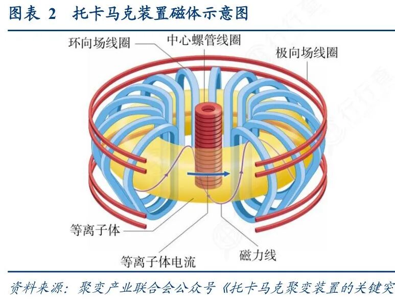 托卡马克装置是磁约束聚变装置中发展最成熟、研究最深入的类型,核心结构由环形真空室、纵场线圈、极向场线圈构成。