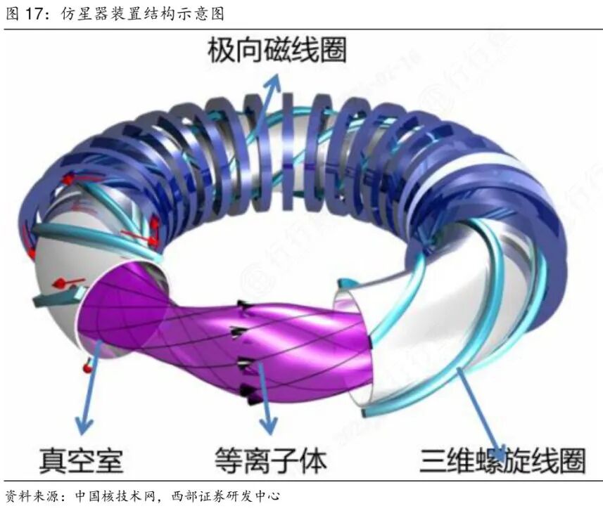 仿星器装置同样基于磁约束原理,与托卡马克的核心区别在于磁场产生方式:托卡马克的螺旋磁场由纵向磁场与极向磁场叠加形成,而仿星器通过螺旋状线圈直接环绕非圆形真空室,直接产生螺旋形约束磁场。