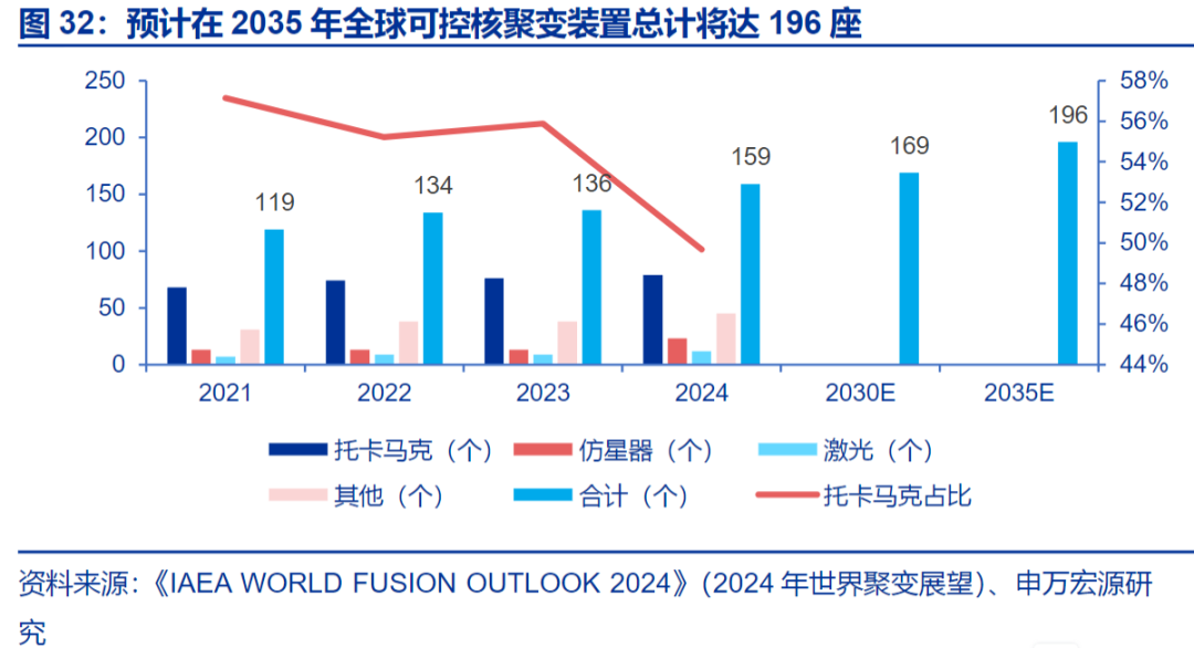 根据国际原子能机构(IAEA)的报告数据,全球可控核聚变装置将在2025-2035E迎来密集建设期,预计在2035年全球可控核聚变装置总计将达196座。