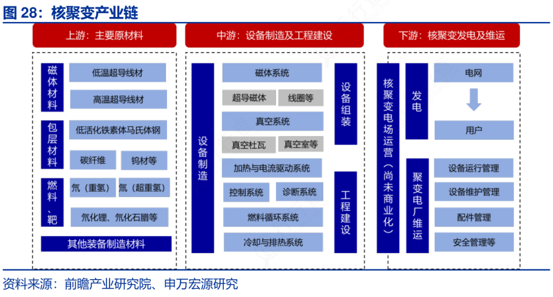 下游主要指向可控核聚变技术商业化后的能量利用与相关配套产业。核心方向是核聚变发电站的建设与运营,包括能量转换系统、电网接入系统、配套储能装置等;同时也延伸至特殊领域的能源应用。