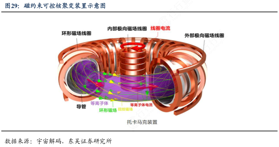 磁约束聚变装置,主要利用磁场对带电粒子的洛伦兹力,将上亿摄氏度的高温等离子体约束在特定空间内,同时实现等离子体的加热与压缩。由于等离子体带电特性,磁场可形成有效的“无形牢笼”,因此磁约束是目前最主流的技术路线,核心装置包括托卡马克装置与仿星器装置。