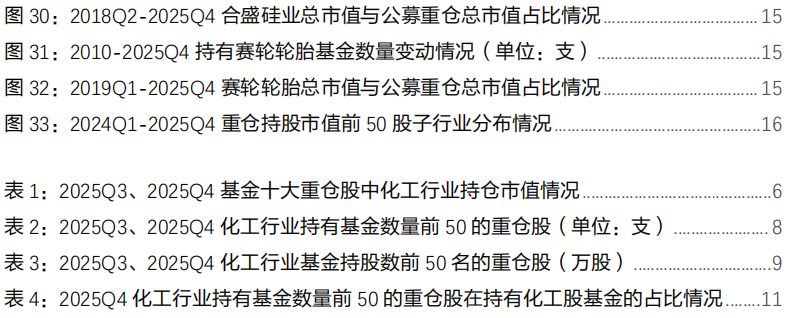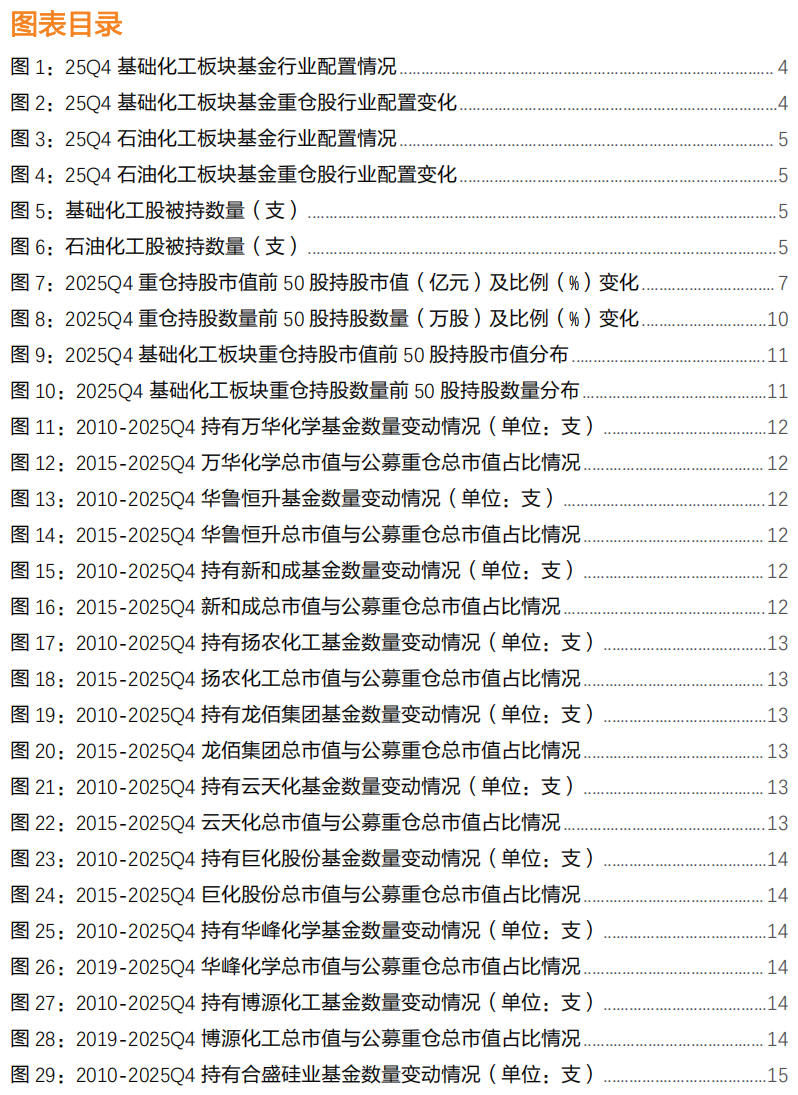 根据披露规则,公募基金十大重仓股票信息应于每季度结束后15天内完成披露,2025Q4公募基金十大重仓股已经完全披露,本文分析主要基于化工行业(基础化工、石油石化)十大重仓股情况进行。