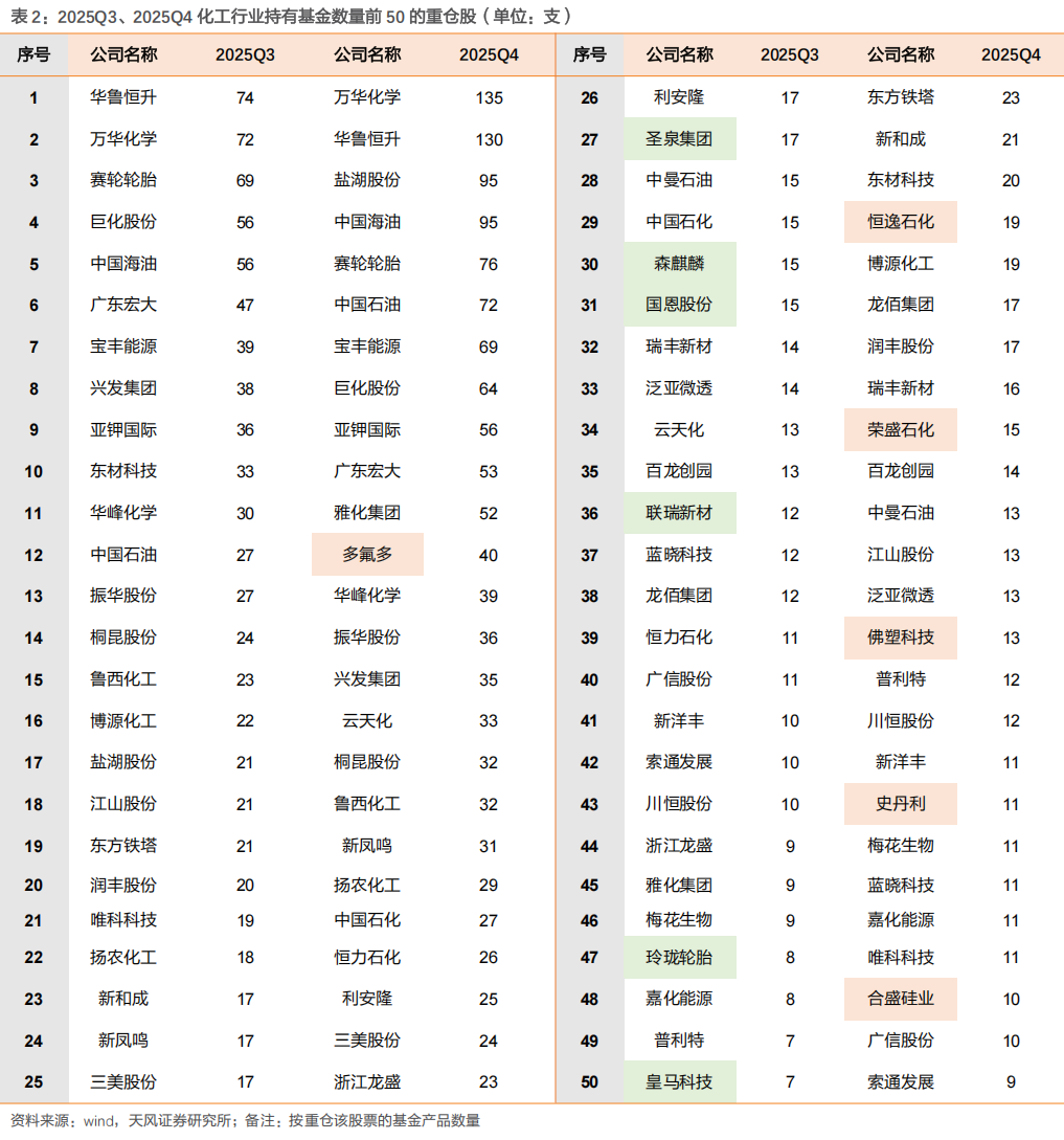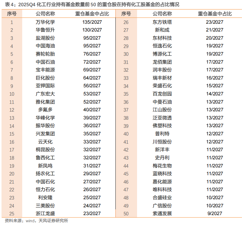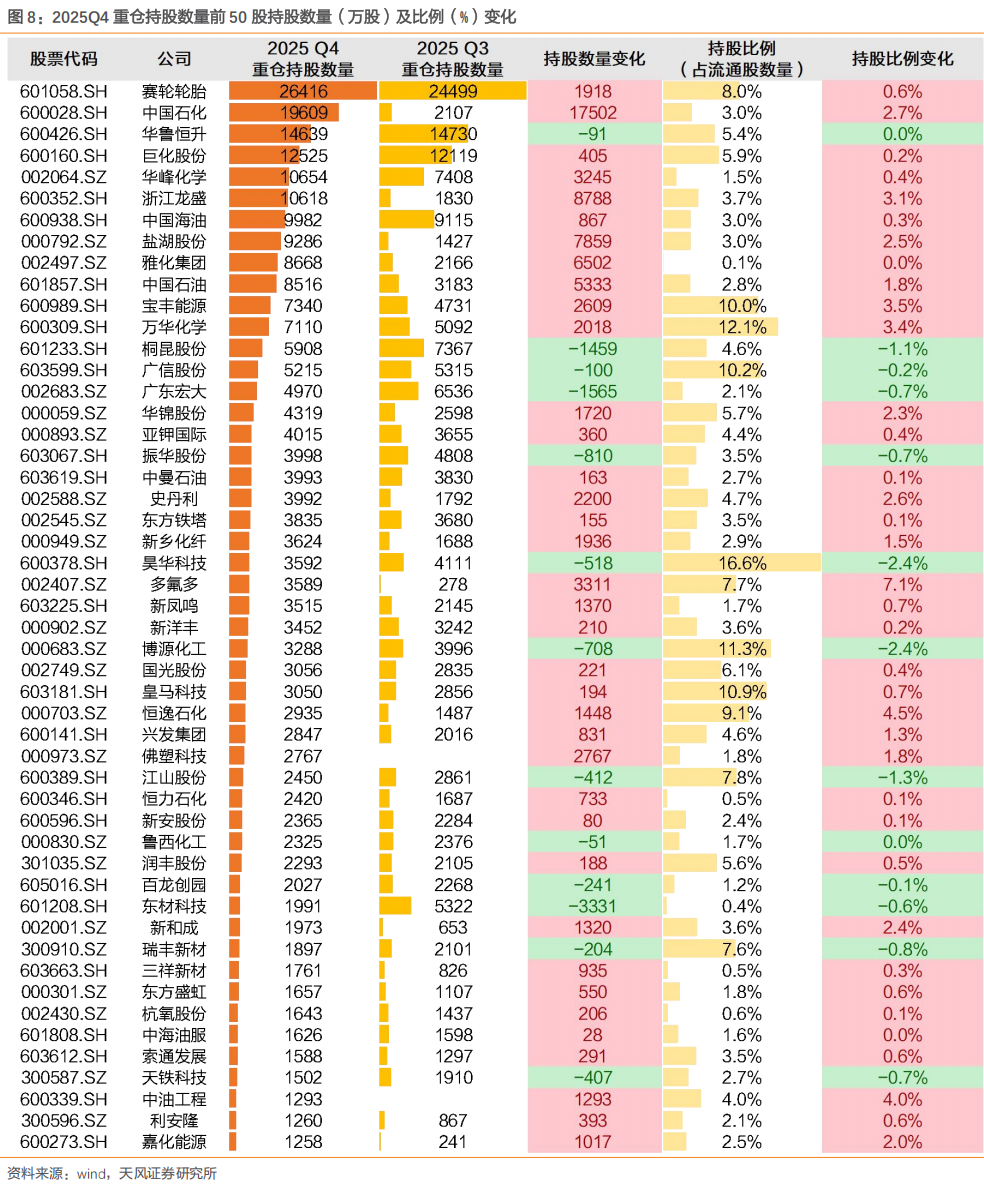 2025年Q4化工行业持有基金数量前50的重仓股中万华化学、华鲁恒升、盐湖股份、中国海油、赛轮轮胎位居前五位,与25Q3对比,盐湖股份取代巨化股份进入前五。其他具体变化为: