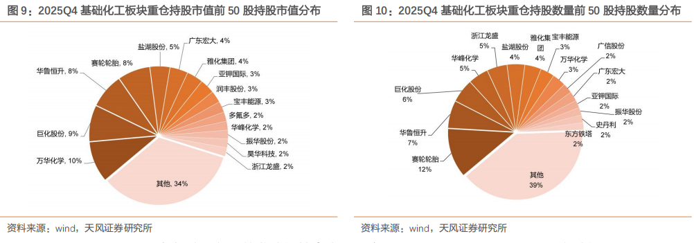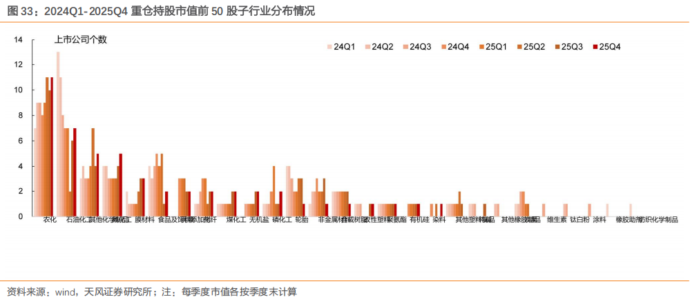 从重仓持股市值前50股的子行业分布看,2025Q4农化行业配置的公司数目依旧维持最多,该子行业共配置11家上市公司,占比22%,环比 1家;其次是石油化工、其他化学制品、氟化工、膜材料行业,2025Q4分别配置7/5/5/3家,占比分别14%/10%/10%/6%。与2025Q3持仓相比,环比新增的子行业有农化、石油化工、其他化学制品、氟化工、食品及饲料添加剂、磷化工、染料。2025Q4前五大配置子行业内上市公司分别是: