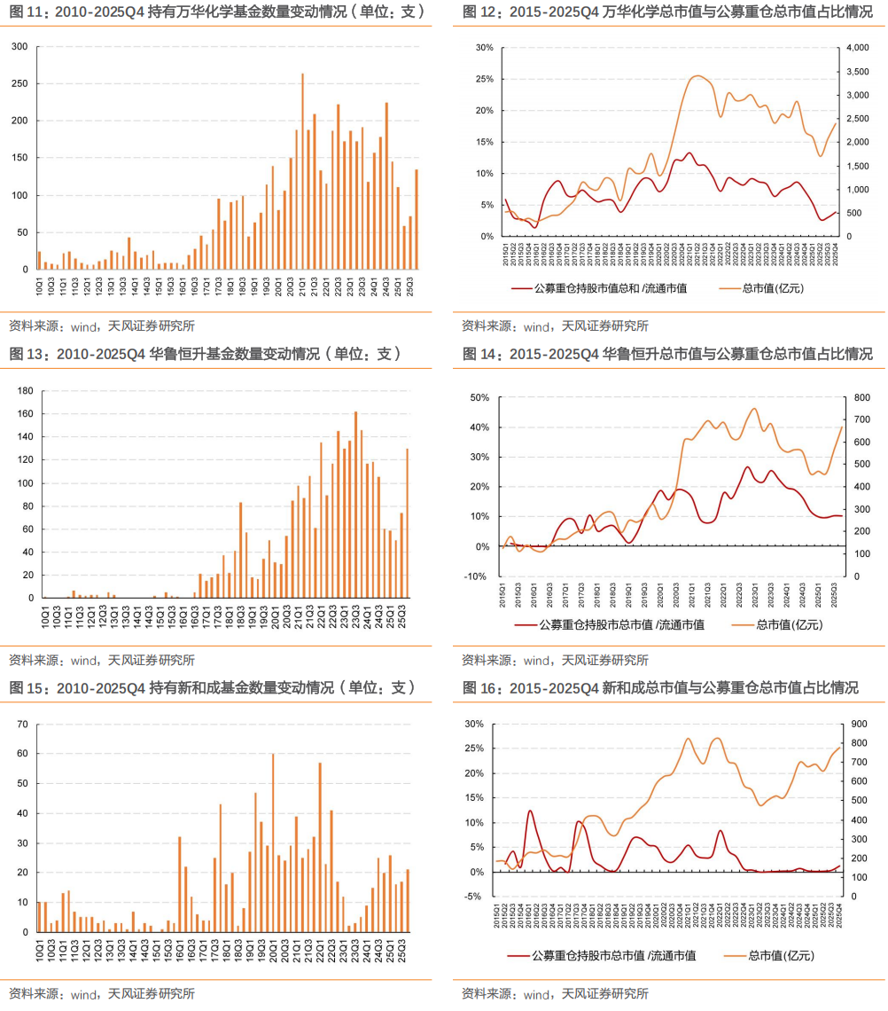 各细分子行业的龙头保持为主要重仓股。2025Q3、2025Q4化工股分别出现在1430、2027支基金产品的重仓股列表中。从重仓化工股的基金产品数量来看,2025Q4持有万华化学的基金产品数量为最多,为135支,环比 63支;其他被基金产品持有较多的股票分别为华鲁恒升(130/2027,环比 56支)、盐湖股份(95/2027,环比 74支)、中国海油(95/2027,环比 39支)和赛轮轮胎(76/2027,环比 7支)。