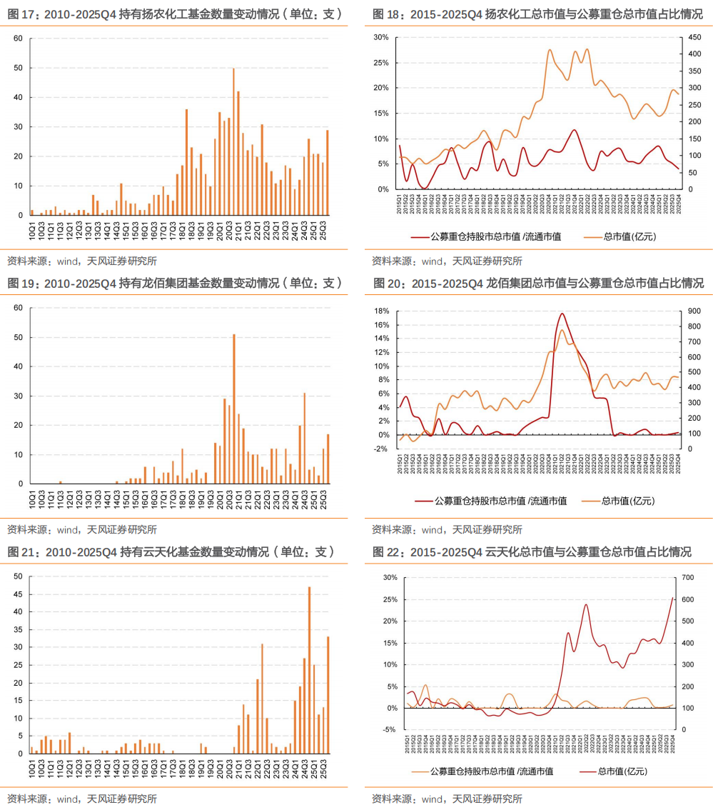 我们共选取重点关注的11支细分子行业龙头股进行具体分析,2025Q4除博源化工外,持有其余子行业龙头股的基金产品的数量均环比提升。