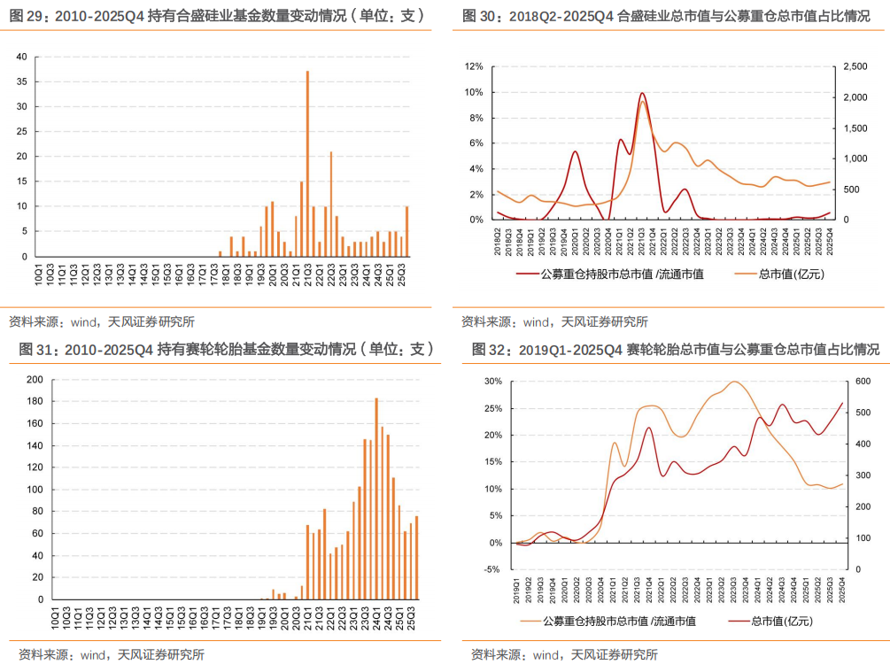 2025Q4,石英股份、唯科科技、斯迪克、森麒麟、玲珑轮胎、圣泉集团、博源化工、潜能恒信、联瑞新材退出公募基金持有市值前50名。