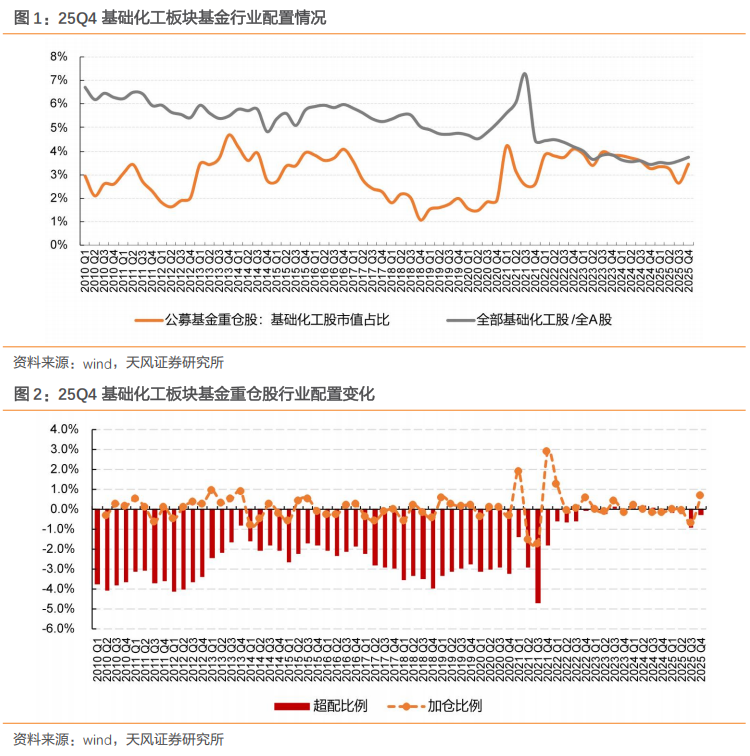 2025年四季度基础化工重仓持股比例同环比明显提升,该季度公募基金所持基础化工股市值占重仓持股配置比例为3.46%,yoy 0.18pcts,qoq 0.80pcts;2025Q4基础化工股票于A股中市值占比为3.75%,yoy 0.31pcts,qoq 0.16pcts,基础化工行业低配0.29%,低配比例qoq 0.65pcts。