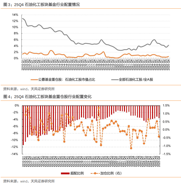 石油化工板块方面,2020 Q3以公募基金石油化工股票整体配置比例提升趋势明显,在经历21Q4的小幅回落后,到22Q3逐步平稳,22Q4比例小幅下降。2023Q1-Q4,持仓比例呈现波动,24Q2公募基金所持石油化工股市值占其重仓持股配置比例为1.17%,达到阶段性高点;随后该比例回落至0.35%(25Q3)。25Q4石油化工持仓比例为0.56%, yoy-0.17pcts,qoq 0.20pcts,同期石油化工股票于A股中市值占比为4.19%,yoy-0.55pcts,qoq 0.62pcts。