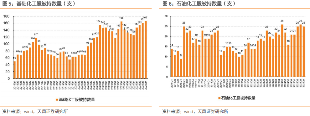 2025Q4公募基金重仓股持股个数同环比继续提升,创历史最高水平。申万行业(包括轮胎)化工股被持个数(公募基金重仓股)方面,2023年以来基础化工行业共有56支新股上市,公募基金可投资标的范围扩大。截至2025Q4共有166支股票有基金持仓,同比 41支,环比 5支;石油化工股25Q4有25支股票有基金持仓,同比 4支,环比-1支。