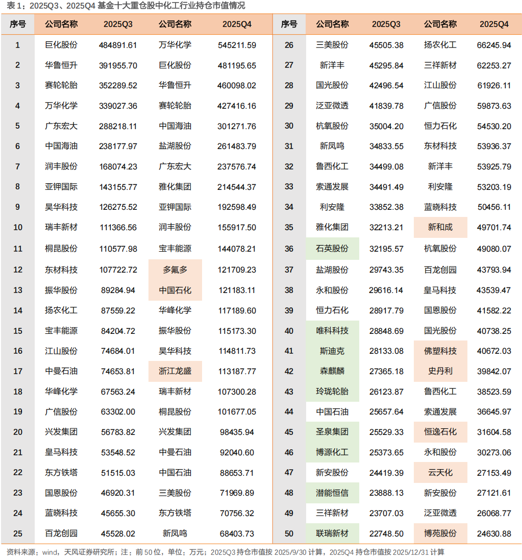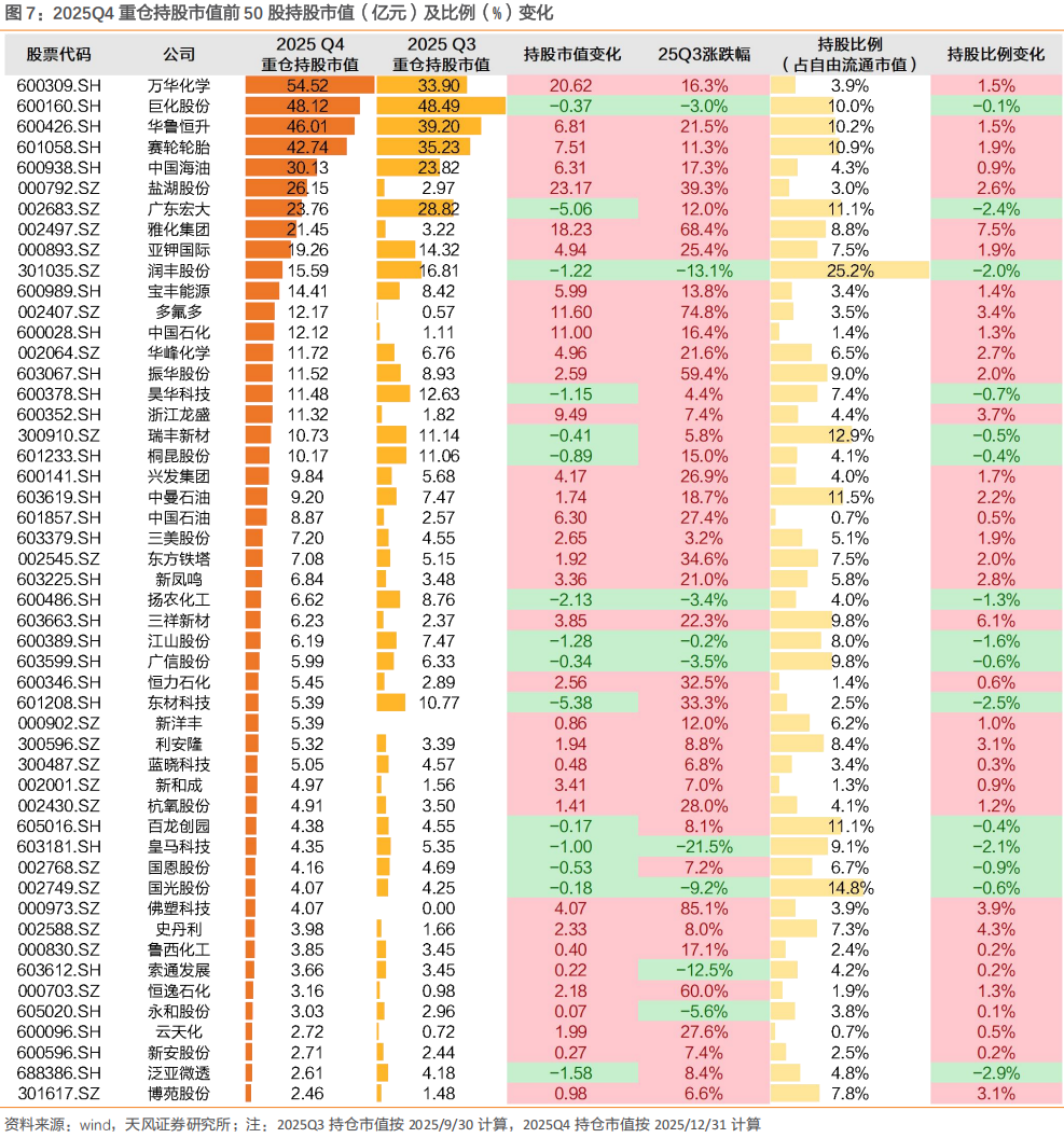 2025Q4,多氟多、中国石化、浙江龙盛、新和成、佛塑科技、史丹利、恒逸石化、云天化、博苑股份进入公募基金持有市值前50名;