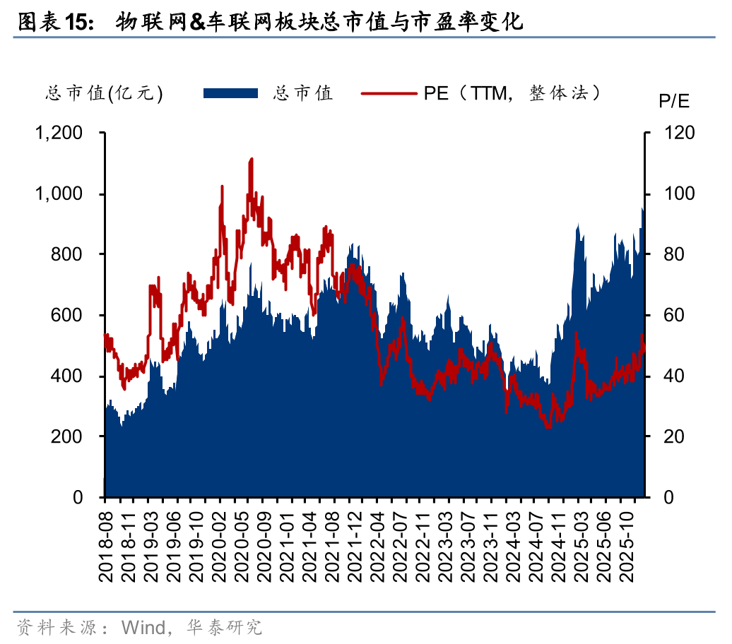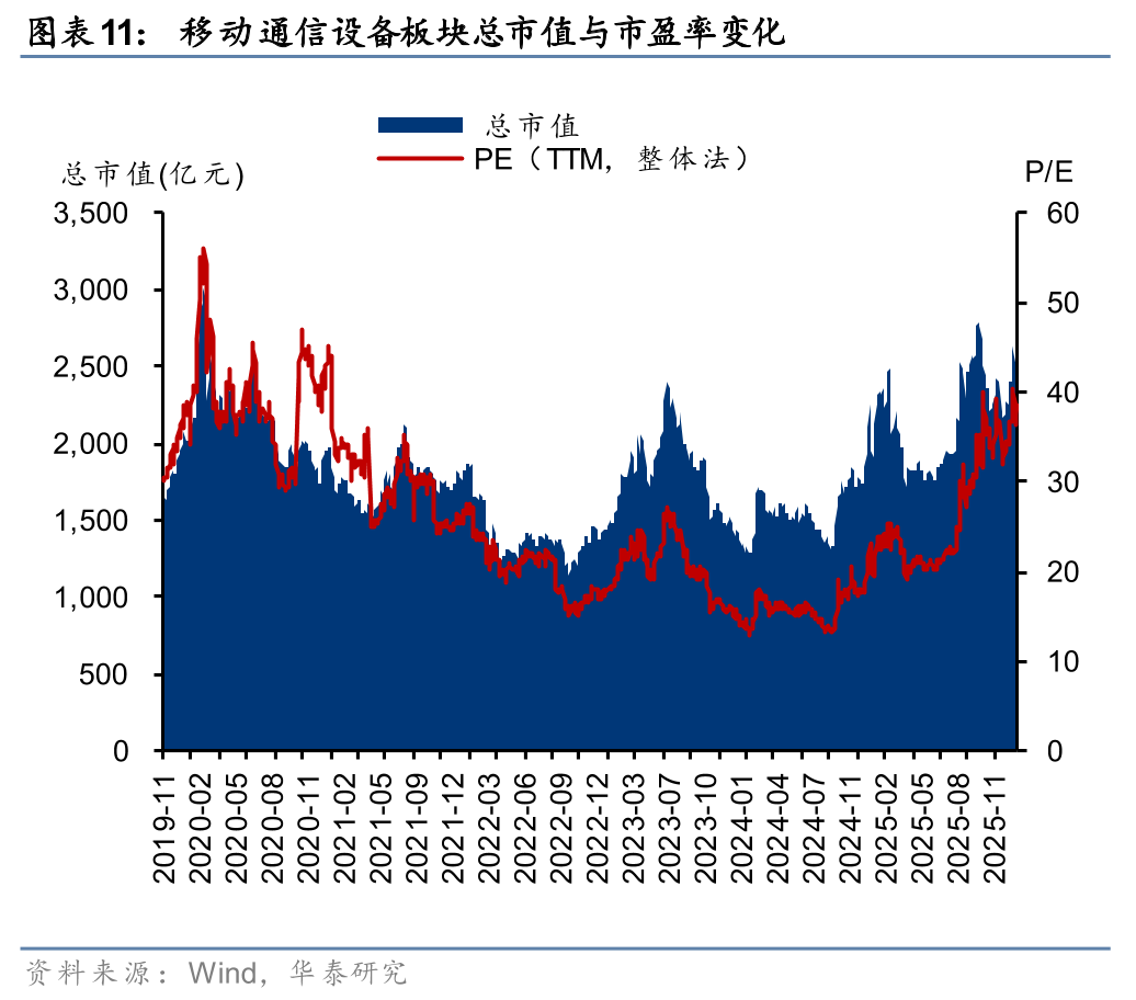 根据我们对公募基金2025年四季报统计, 4Q25公募基金前十大重仓中通信板块A股持仓占比8.75%,环比上升0.91pct;4Q25板块超配比例为5.25%,较3Q25上升1.89pct。4Q25 公募基金加仓液冷、光芯片、数据中心、北斗等板块,减仓光纤光缆、通信设备等板块。中际旭创、新易盛、天孚通信、英维克、源杰科技为4Q25持仓市值增幅前五个股,基金持股总市值分别较3Q25末增加510.74/144.46/47.62/43.15/42.90亿元。估值层面,2026年1月23日通信(申万)市盈率TTM为50.01x,系2011年初至今83.1%历史分位数。