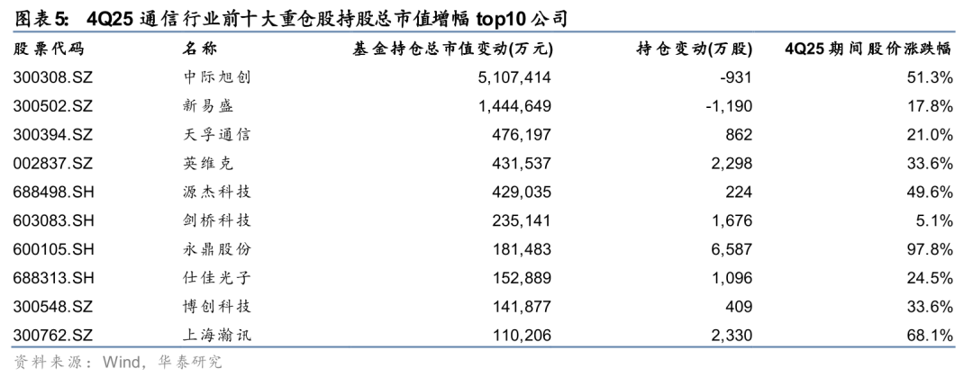 中际旭创、新易盛、天孚通信、英维克、源杰科技为4Q25持仓市值增幅前五个股。4Q25基金前十大重仓持股总市值增幅前五的公司依次为中际旭创、新易盛、天孚通信、英维克、源杰科技,基金持股总市值分别较3Q25末增加510.74/144.46/47.62/43.15/42.90亿元;个股涨跌幅方面,以上五者4Q25期间涨幅分别为51.3%/17.8%/21.0%/33.6%/49.6%。4Q25持股股本变动方面中际旭创、新易盛、天孚通信、英维克、源杰科技分别较3Q25末变动-931、-1,190、862、2,298、224万股。