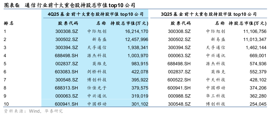 中际旭创、新易盛、天孚通信、源杰科技、英维克位列通信行业4Q25前五大重仓股。从4Q25基金前十大重仓持股总市值来看,排名前五的个股分别为中际旭创、新易盛、天孚通信、源杰科技、英维克,持股总市值分别为1,621.42/1,245.80/193.83/100.40/98.39亿元。与3Q25情况对比来看,中际旭创、新易盛、天孚通信保持排名不变、源杰科技上升1名位列第4、英维克上升一名位列第5。