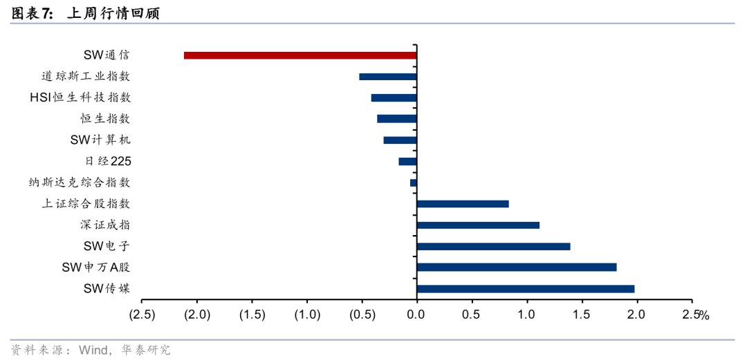 市场方面,上周通信(申万)指数下跌2.12%,同期上证综指上涨0.84%,深证成指上涨1.11%。据我们对公募基金2025年四季报的统计,4Q25通信板块基金前十大重仓中持仓占比8.75%,环比上升0.91pct;4Q25通信板块超配比例持续提升,超配比例为5.25%;液冷、光芯片、数据中心、航天等板块获增持。建议关注全球AI算力链投资机遇(光模块、液冷、铜连接、交换机等)以及商业航天板块投资机遇(火箭、卫星、终端)。