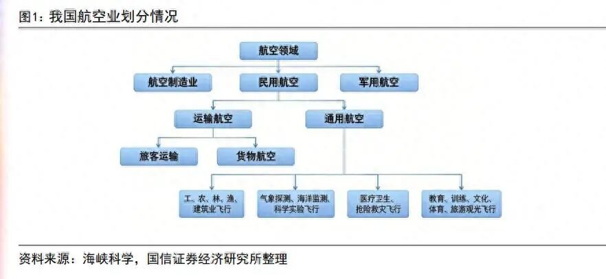 除了军用以及民用客货运航班以外,其他所有的飞行活动都可以归入通用航空的范畴,包括从事工业、农林牧渔、建筑业等作业飞行,以及天气干预、遥感遥测、科学实验、飞行娱乐、飞行培训、短途通勤以及应急救援等飞行活动,飞行高度通常在 6000 米以下。通用航空以灵活航线或非航线、个性化的服务为特点,作业范围广、作业空域低、作业时效性强,涉及多样化民用领域。通用航空业是以航空器制造和飞行活动为核心,涵盖市场运营、综合保障以及延伸服务等全产业链的战略性新兴产业体系,具有产业链条长、服务领域广、带动作用强等特点。传统通航和新兴无人机产业都是通用航空业的有机组成部分,二者紧密联系、相互融合,共同提升航空服务的覆盖范围和服务质量。