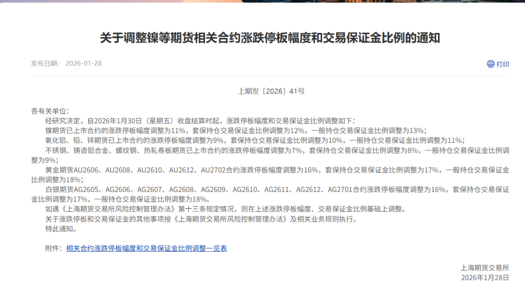 上期所28日公告,经研究决定,自2026年1月30日(星期五)收盘结算时起,涨跌停板幅度和交易保证金比例调整如下: 1. 镍期货已上市合约的涨跌停板幅度调整为11%,套保持仓交易保证金比例调整为12%,一般持仓交易保证金比例调整为13%; 2. 氧化铝、铅、锌期货已上市合约的涨跌停板幅度调整为9%,套保持仓交易保证金比例调整为10%,一般持仓交易保证金比例调整为11%; 3. 不锈钢、铸造铝合金、螺纹钢、热轧卷板期货已上市合约的涨跌停板幅度调整为7%,套保持仓交易保证金比例调整为8%,一般持仓交易保证金比例调整为9%; 4. 黄金期货AU2606、AU2608、AU2610、AU2612、AU2702合约涨跌停板幅度调整为16%,套保持仓交易保证金比例调整为17%,一般持仓交易保证金比例调整为18%; 5. 白银期货AG2605、AG2606、AG2607、AG2608、AG2609、AG2610、AG2611、AG2612、AG2701合约涨跌停板幅度调整为16%,套保持仓交易保证金比例调整为17%,一般持仓交易保证金比例调整为18%。