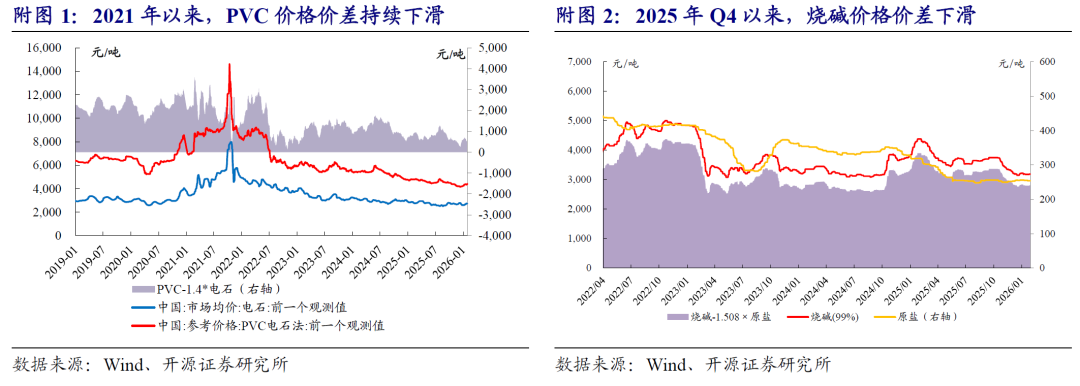 2025年Q4,除了乙烯法PVC企业以及部分位于内蒙古的企业,其他氯碱企业均进入大面积亏损状态。据我们计算,2025年Q3氯碱双吨净利润约182元/吨,但进入2025年Q4氯碱双吨净利润为-49元/吨,行业大面积亏损。2026年之后烧碱盈利能力下降,以碱补氯的局面较难维持,加速行业产能退出。此2026年1月9日财政部取消PVC出口退税、未来双碳推进下对氯碱这类高耗能行业或进行相关限制,行业内落后产能有望加速退出。再叠加2026-2027年PVC行业无新增产能,PVC供给端格局将进一步优化。