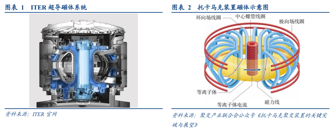 以ITER项目为例,ITER要把由氘、氚组成的上亿度高温等离子体约束在一个有限的空间里,产生50万千瓦的聚变功率,持续时间达500秒,如此高的温度无法采用任何实体材料来约束,因此需要采用超导磁体系统产生的强磁场对高温等离子体进行约束以使其避免与容器壁接触,从而实现聚变反应。