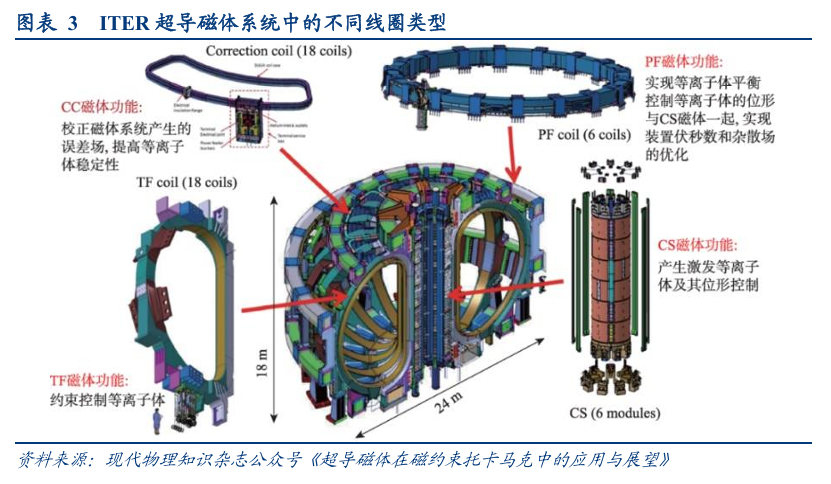以ITER项目为例,根据西部超导定增募集说明书,ITER设计共有超导大型磁体48个,具体包括:18个纵场线圈(TF)、6个极向场线圈(PF)、6个中心螺管线圈组成的中心螺管(CS)和18个校正场线圈(CC)。