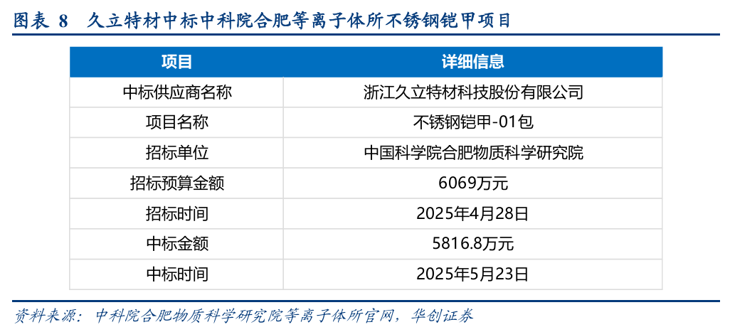 2025年5月23日,久立特材中标中国科学院合肥物质科学研究院的不锈钢铠甲项目,中标金额为5816.8万元,彰显了其较强的铠甲材料供应能力。中科院合肥物质科学研究院等离子体所为国内核聚变领域权威科研机构,久立特材斩获重要订单,验证了公司具备较强的技术实力。