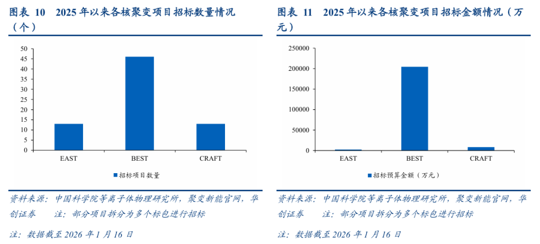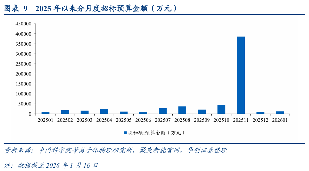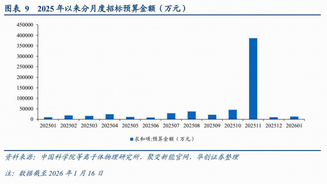 根据我们统计的招标数据,2025年11月,中科院合肥等离子体物理研究所及聚变新能安徽的招标项目显著放量,仅11月招标金额就达到39亿量级,而2025Q1、2025Q2、2025Q3的招标金额分别仅为4.48、4.40、8.72亿元,11月单月招标金额已显著超过前三季度招标金额的总和。2026年1月以来(统计周期为01/01~01/16),招标总额约为1.28亿元。