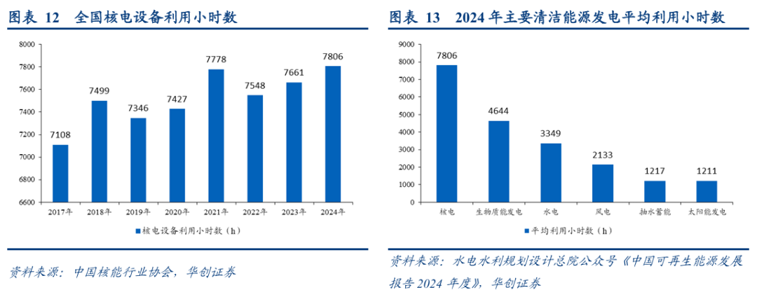 根据中国核能行业协会的数据,过去8年内,全国核电平均利用小时数均稳定在7000小时以上,在2024年达到7806小时,约为生物质能发电的1.7倍、水电的2.3倍、风电的3.7倍。