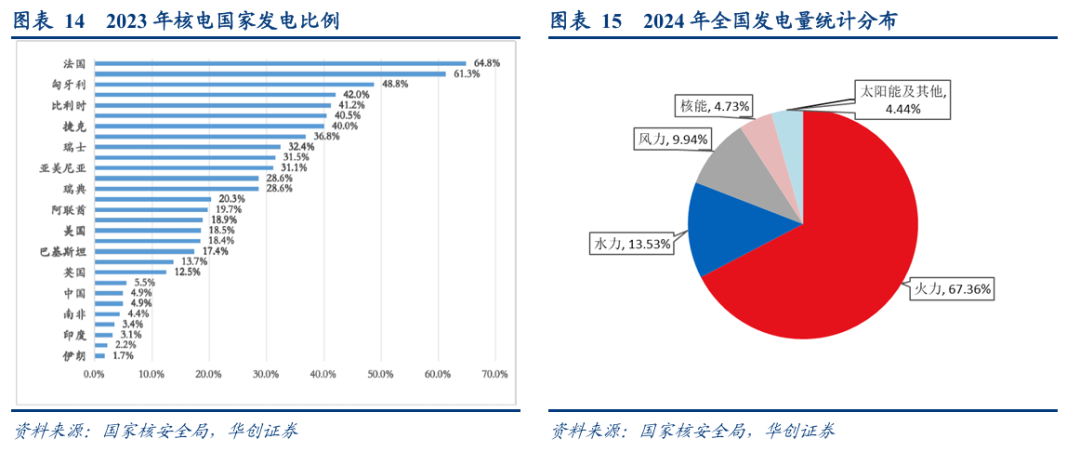 我国核电发展空间可观。根据《World Nuclear Industry Status Report 2024》,2023年,核能在全球总发电量中所占的份额为9.15%。据国家核安全局数据,全球核电国家中核能发电占总发电量高于10%的有20余个,其中法国约为64.8%,俄罗斯约为18.4%,美国约为18.5%,加拿大约为13.7%,英国约为12.5%,而中国2023年核电占比仅有4.86%。即使到2035年,中国核电占比达到《“十四五”现代能源体系规划》中的目标10%,也仅达到当前全球平均水平,提升空间仍然较大。