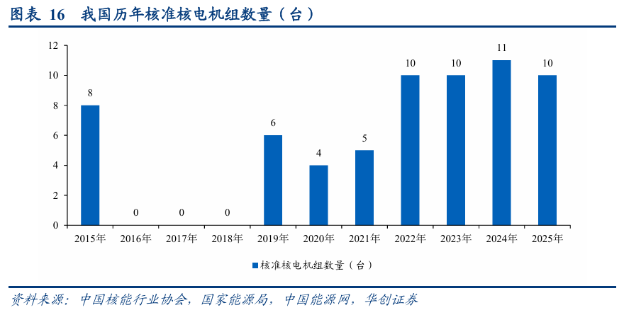 为适应能源结构调整和加快清洁能源发展的需要,我国核电建设加快推进。2023年国内核准10台核电机组。2024年8月19日,国务院常务会议审议决定核准江苏徐圩一期工程等五个核电项目,合计11台机组,创下历年核准最高纪录。2025年4月27日,国务院常务会议审议决定核准浙江三门三期工程等5个核电项目共计10台机组。行业进入常态化建设,为核电设备供应商提供长期订单支撑。