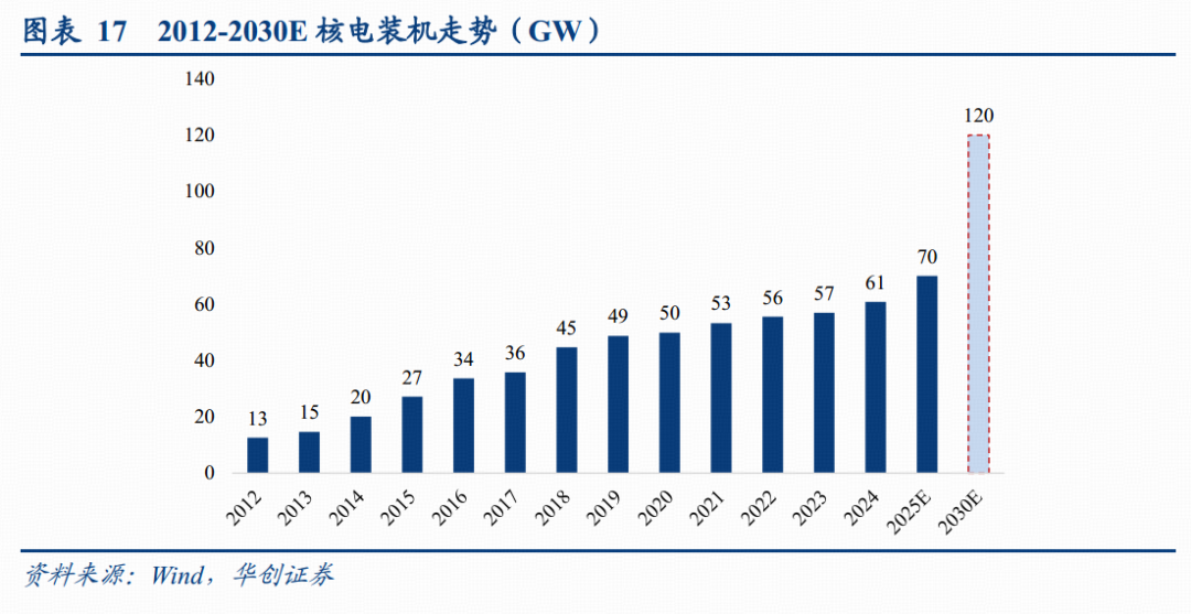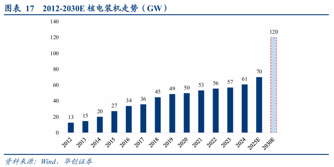 按照中国核能行业协会预计,到2030年核电在运装机容量可达到120GW,截至2024年核电累计装机为61GW,意味着在2025到2030的6年中需要完成59GW的新增核电装机,即到2030年之前每年需要新增10GW,按照核电单台1GW来计算,大约一年需要新增10台核电机组,预计在未来的一段时间核电资本开支仍将向上。