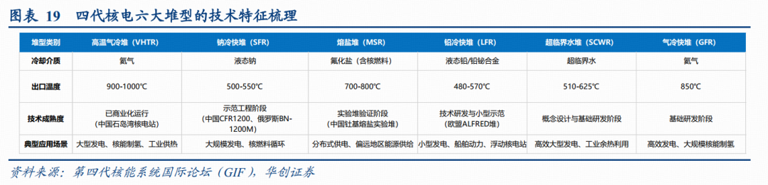 四代核电技术呈现多元化发展格局。根据第四代核能系统国际论坛(GIF)数据,基于不同冷却介质与核反应原理,四代核电六大堆型在技术路径、应用场景与核心优势上各有侧重,共同构成了多元化的发展体系,其中高温气冷堆已实现商业运行突破,钠冷快堆与熔盐堆处于示范验证实验堆关键期,其余堆型仍以技术研发为主。